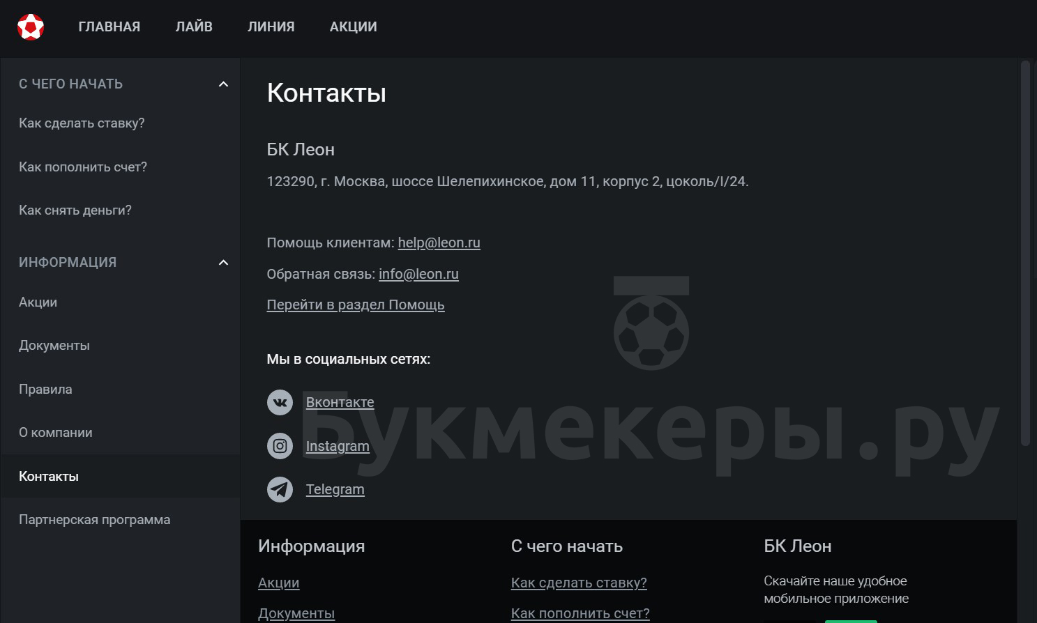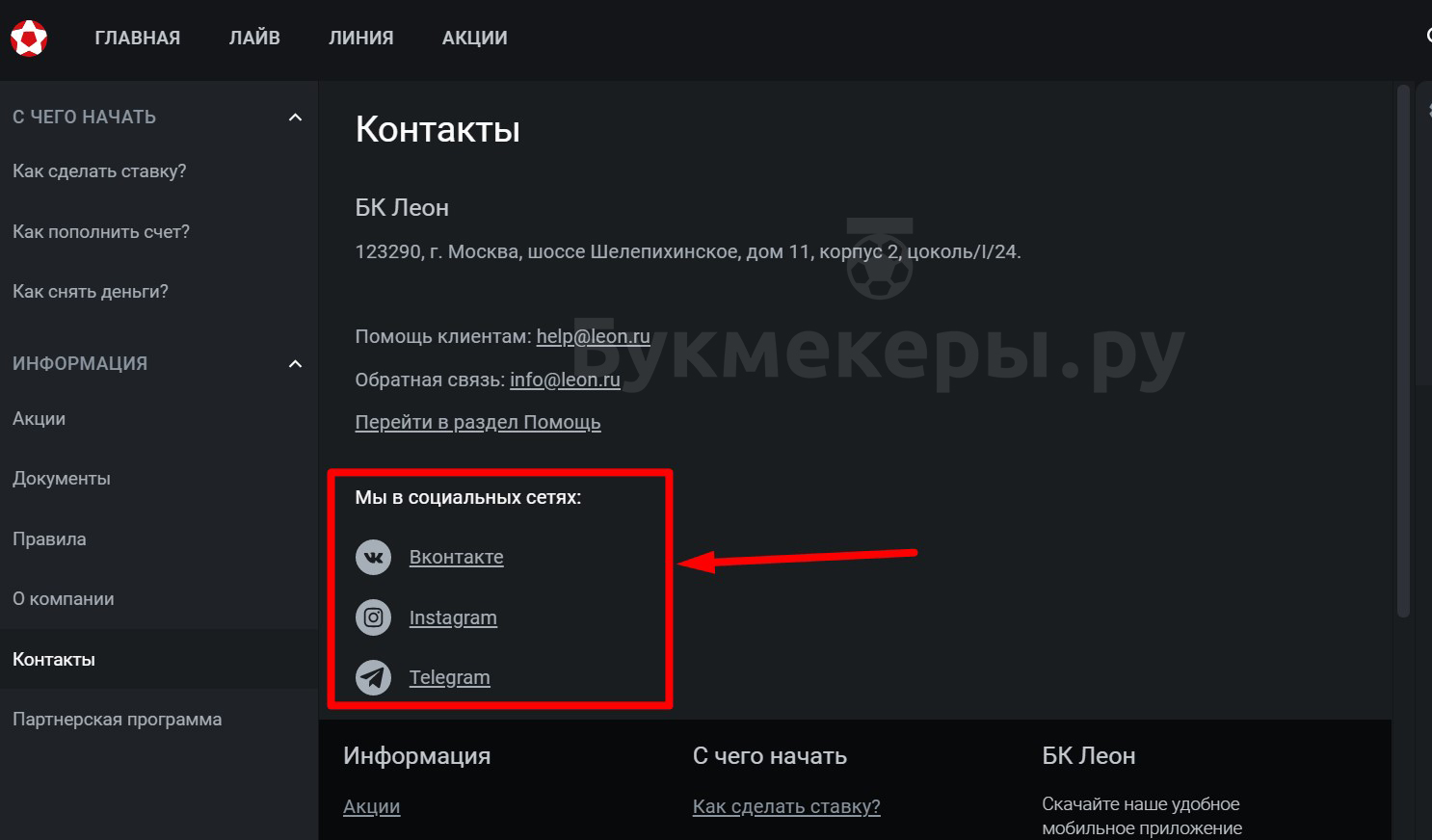 Форма обратной связи с букмекерской конторой Леон расположена в нижнем меню на легальном в РФ сайте компании, раздел «Контакты».
