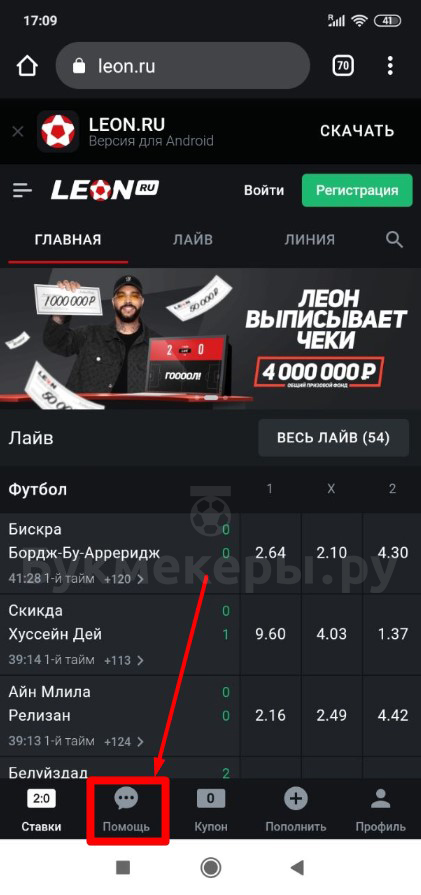 «Помощь» мобильной версии сайта на телефоне расположена в нижней части экрана Леонбетс.
