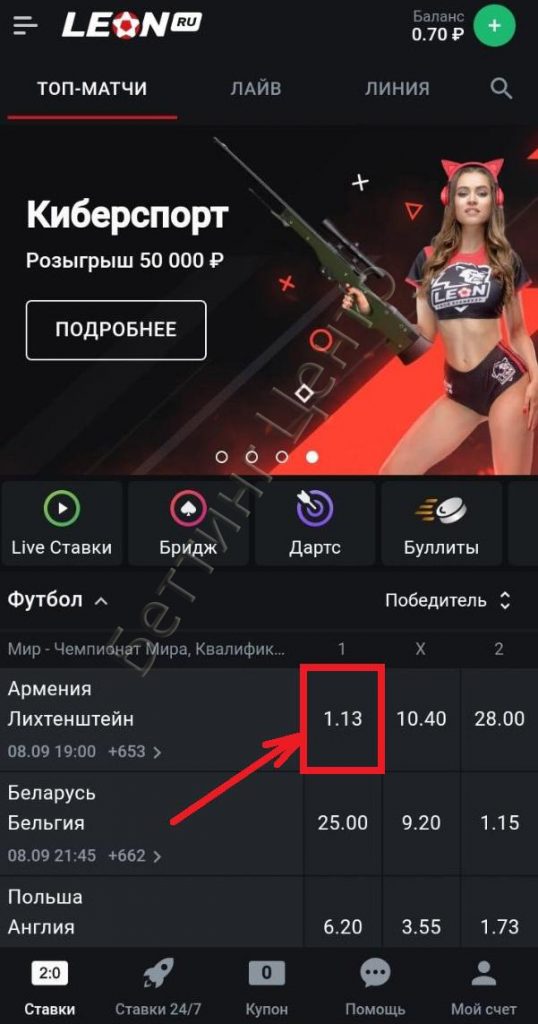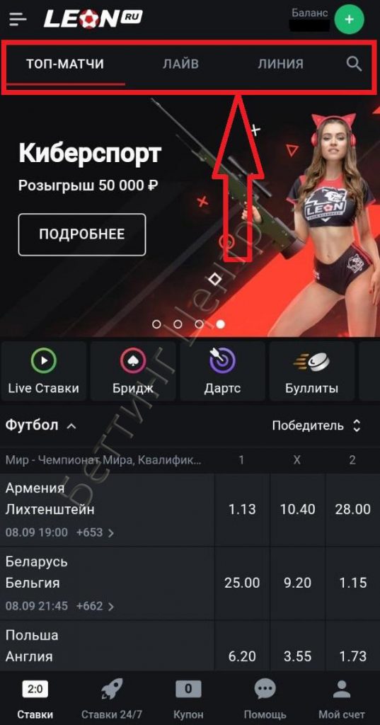 На главной странице приложения Леон расположено меню, где вы сразу сможете перейти в раздел Лайв, Линию или на ближайшие матчи.