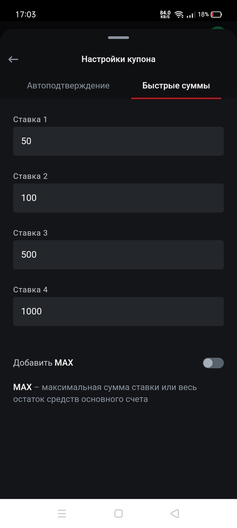 В приложении перед заключением пари можно настроить купон, установив автоподтверждение коэффициентов (при любых изменениях котировок, либо только при росте коэффициентов), а также указав четыре суммы — по умолчанию это 50, 100, 500 и 1000 рублей. Однако игроки могут изменять эти значения. При заключении пари игроку не придется вручную вводить сумму ставки, достаточно выбрать одну из четырех быстрых сумм.